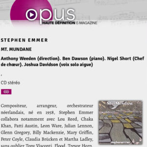 Stephen Emmer – Mt. Mundane : Anthony Weeden (direction), Ben Dawson (piano), Nigel Short (chef de choeur), Joshua Davidson (voix solo aigue) Compositeur, arrangeur, orchestrateur